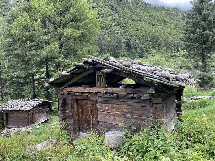 隨著海拔高度的升高與緯度的增加,一路上的植被類型也在不斷發(fā)生著變化。穿越深闊的暗針葉林,六匹馬起起落落的腳力踩出了一個馬幫的回音,所有的植物在各自的生命活動中散發(fā)出了清新怡人的芬多精,吉美為此小聲哼唱起了愉悅的歌兒,細聽卻又像是兩只云雀在不遠處鳴囀。再往上走,周遭的林木又轉(zhuǎn)換成了密致的高山杜鵑林,無數(shù)修長的木流蘇垂掛在樹枝上,像哈達。一路沉默的南杰轉(zhuǎn)頭來開始與我說話“六月間,這里的每一棵樹都開滿了粉白的花朵,一樹樹的煞是壯觀好看,我一個人經(jīng)過,總能聽到一朵、兩朵花鈍落的聲音。最初,我以為是馬雞飛落了,輕聲走入林中打探,身后又會落下一朵、兩朵花,那聲音厚重沉實,林中又過于安靜,我就慌忙走出了林子......”南杰說話聲音秀氣,我聽得時斷時續(xù),過風吹送著南杰話語中杜鵑花的香氣。前路逐漸敞亮起來的時候,路邊的杜鵑樹開始變得稀稀落落了,只見路旁堆壘著高高低低的新鮮柴垛。再往上就沒有樹木了,只有矮腳盤香和淺草,路邊的山包上緊貼著密密麻麻的貌似多肉植物的草葉,從草心抽出來一枝枝薔薇紅的花柱在風中頻頻點頭。雍貝在前方的馬匹上頭低得越來越沉,以為他瞌睡,我喊了聲貝,他回頭看我,面色灰白嘴唇有些發(fā)紫。南杰回望我們后一躍下馬,從路邊的淺草中折斷幾根盤香枝別在雍貝的耳際,說是可以抵御高反。剩余的兩根遞給我,細小的枝葉上積著一層薄薄地灰色粉塵,深嗅有松脂的清香氣味,安人心神。