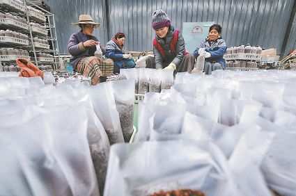 2021年新年伊始,甘孜州的氣溫已經(jīng)降到了零攝氏度以下。1月5日,位于雅江縣八角樓鄉(xiāng)松茸村的松茸產(chǎn)業(yè)園菌種菌包廠房里卻是熱氣蒸騰,數(shù)十位工人正有條不紊地往菌種架上放置菌包。很快,3米多高的鐵架上就密密匝匝的堆滿了制作好的菌包。廠房的旁邊就是食用菌存儲冷庫,各類食用菌在這里進(jìn)行分揀、定級、包裝。十多個(gè)小時(shí)后,經(jīng)物流車送出的一箱箱食用菌產(chǎn)品就會(huì)出現(xiàn)在省內(nèi)外各大超市的生鮮貨架上,市民在千里之外也能嘗到大山里的味道。