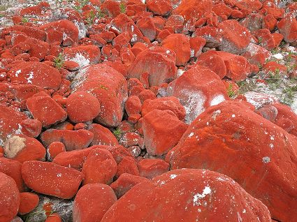 天氣晴朗時,紅石灘的紅石顏色更加漂亮,一條瀑布從山谷間奔流而下,在河水流經(jīng)的河灘上,成片的紅石被藍天、碧水、綠樹,襯得美艷動人……