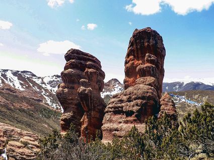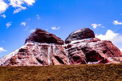 新龍紅山丹霞主要發(fā)育以丹霞石柱、峰叢、方山、石墻、石洞、崖壁等以及各種造型石為主的地貌特征,遠(yuǎn)遠(yuǎn)望去,雄偉壯觀(guān)、千姿百態(tài)。因大部分山峰高出雪線(xiàn),受冰川作用影響顯著,北坡河谷部分有常年片狀積雪覆蓋。