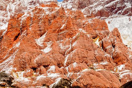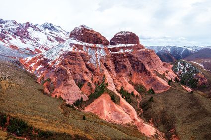 丹霞之美是無(wú)需雕飾的自然杰作。俯望之下,山體“色如渥丹,燦若明霞”,仿佛油畫(huà)創(chuàng)作中大筆涂抹的色塊,不加雕琢的姿態(tài)和毫不掩飾的奔放,展現(xiàn)了自然巨匠潛心創(chuàng)作的自信與率性。濃重的紅艷之上,稍覆冰雪之白,紅與白的碰撞如同冰與火的交融,于火熱熾烈間透出一抹冷峻肅殺。