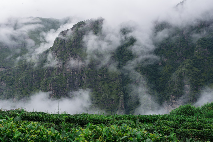 萬畝茶田,背依西北,而望東南。朝云暮雨,