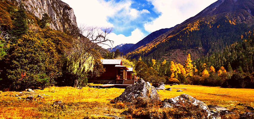 站在山谷放眼展望,金黃的草甸、蜿蜒透亮的小河、參天古木、悠閑啃草的牦牛,點(diǎn)綴其間的幾棟藏房,這一切構(gòu)成一個(gè)幽靜而神奇的世界。步入其間,就像走進(jìn)一個(gè)奇麗而孤寂的世外仙境以及純凈空氣的薈萃之地。置身其中,心曠神怡,仿佛自己是走在一幅渾然天成的美麗畫(huà)卷之中。