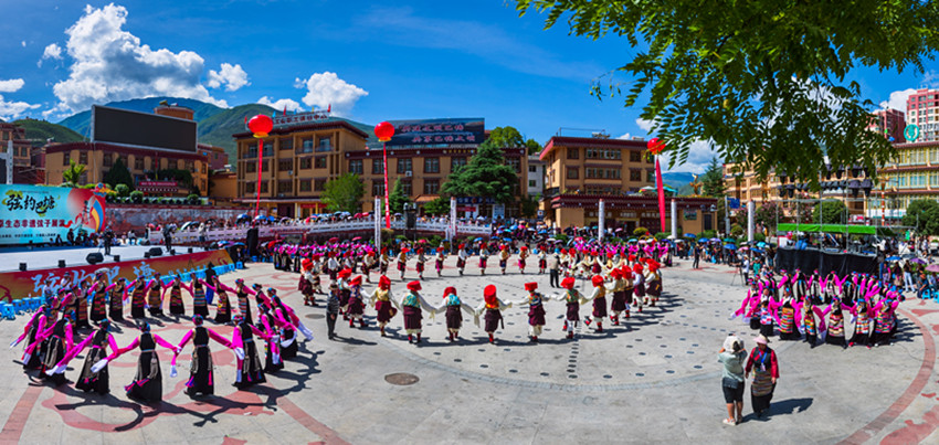 金弦子廣場,舞者們仿若守護者一般,圍著金黃色的弦子雕塑,或輕歌曼舞或昂揚踏步,斑斕的畢旺、搖曳的流蘇和飄逸的紅袖與花共舞,與景相映,聲聲吟唱、步步踏尋,是追憶更是誓言。