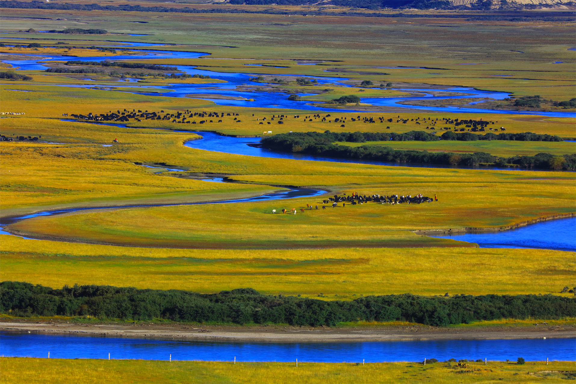 走進(jìn)草原,會(huì)被滿目青青的草地吸引,被五彩野花所誘惑,發(fā)源于海子山的無(wú)量河從草原中部穿過(guò) ,十?dāng)?shù)條大小支流在草原上流趟、注入干流,河兩岸分布著無(wú)數(shù)沼澤濕地。