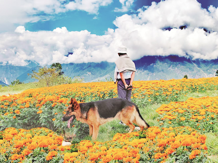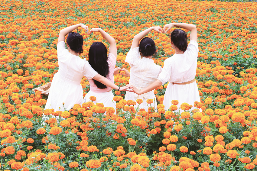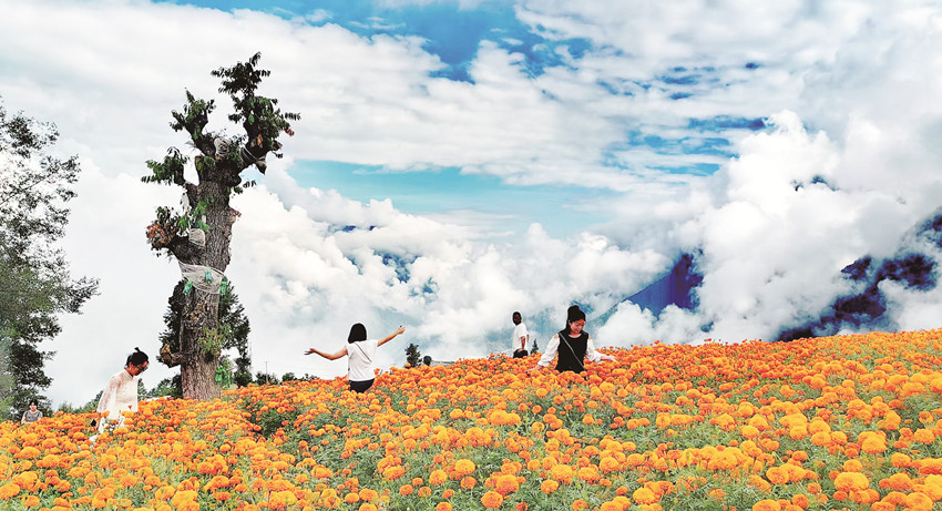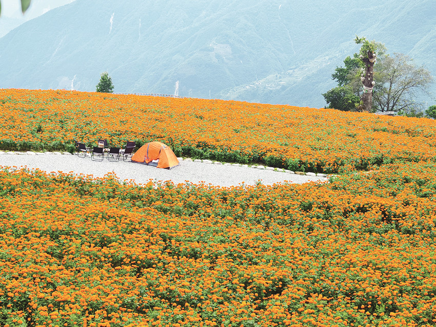 在這金風(fēng)送爽的秋日,瀘定德威加郡海子村18萬(wàn)株萬(wàn)壽菊競(jìng)相綻放,漫步在花海之中,人們可以感受秋風(fēng)的輕撫,呼吸清新的空氣,寧?kù)o的村寨依托著貢嘎雪山、藍(lán)天白云,在成片的萬(wàn)壽菊裝點(diǎn)下構(gòu)成了一幅亮麗的鄉(xiāng)村畫卷。
