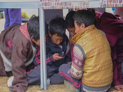 孩子們席地而坐就餐。