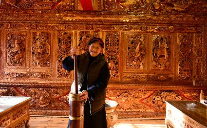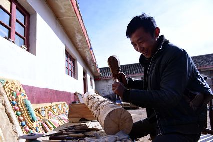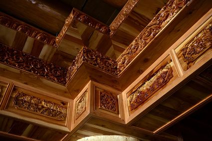 道孚民居的精華在其內(nèi)部,木材是其唯一的內(nèi)部裝飾材料,而裝飾,是一項(xiàng)繁瑣得曠日持久的藝術(shù)勞作,往往建房只需一兩個(gè)月,內(nèi)部裝飾則要幾年甚至幾十年。民間建筑藝術(shù)家們沉醉在細(xì)致入微的勞作里,讓每一個(gè)圖案都盈溢一份心底的吉祥,讓每一筆描摹都傳遞一份動(dòng)人的傳說(shuō)。房間四壁、房門(mén)和梁柱上一般都繪滿(mǎn)了精致典型的藏式壁畫(huà),窗上分別雕刻著龍、鳳、仙鶴、麒麟等吉祥圖案。每間屋的大門(mén)上都鑲嵌醒目的兩個(gè)獅頭大銅環(huán),凸顯了與之相融的漢文化的特點(diǎn)。置身其間,色彩斑斕中,身邊盡是龍飛鳳舞,鶴翔麟躍。繽紛中細(xì)端詳,真是藏民族藝術(shù)的天堂!
