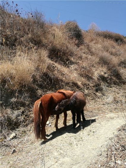 晴天里有陽(yáng)光,陽(yáng)光總是充滿愛(ài)和溫馨,無(wú)論人或是動(dòng)物,母愛(ài)都是最寶貴的甘露。行走在阿里布果,無(wú)限愜意油然而生,徜徉在陽(yáng)光的懷抱,心寧而靜。突然,馬鳴聲打破了這份寧?kù)o,一匹黃馬一邊吃著草,一邊吼叫,不一會(huì)兒,一匹小馬駒飛奔而來(lái),走到黃馬身旁,吮吸著甘甜的乳汁。天很藍(lán),陽(yáng)光很溫暖,世上有一種最美麗的聲音,那便是母親的呼喚。