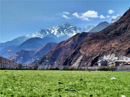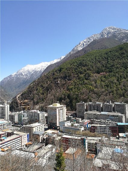 天空像剛被浸染的綢緞,蔚藍(lán)的主色已經(jīng)略顯;白雪好似從浸染的綢緞上滴落下的顏料與其它顏色的混合,眷戀的駐足在山尖,在其耳旁傾訴來(lái)年的約定;一顆顆萬(wàn)年青穩(wěn)穩(wěn)的站立,將山中的寺廟、亭閣緊緊地包圍,見(jiàn)證著康定四季輪回的變化;依然披著秋冬贈(zèng)予黃色外衣的樹(shù)木,拋開(kāi)桎梏,堅(jiān)守在一座座樓房旁。藍(lán)與白,黃與綠……這大美的晴天為人們帶來(lái)了別樣的視覺(jué)盛宴。