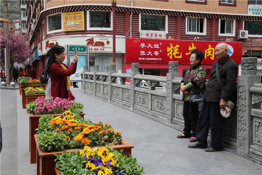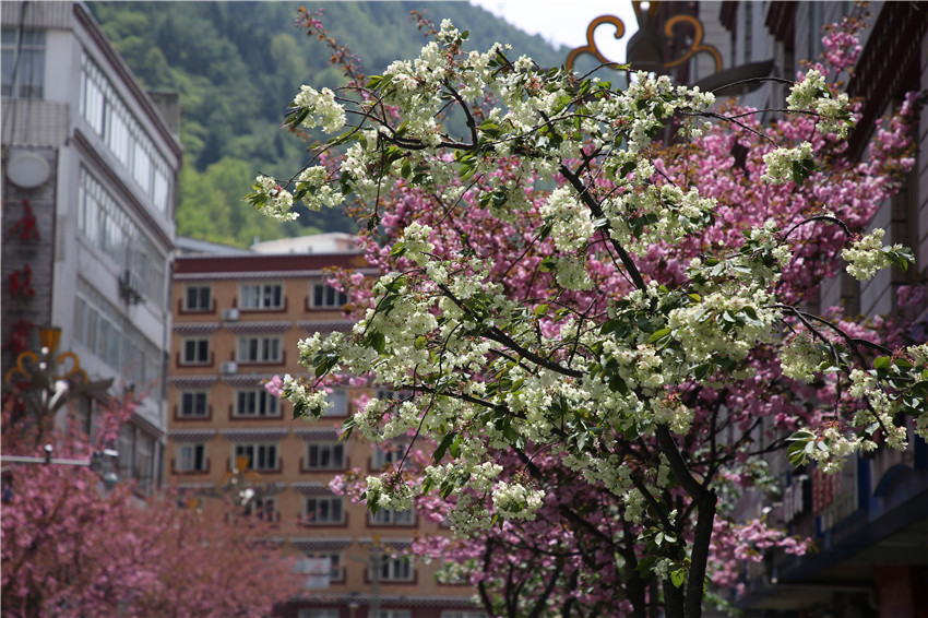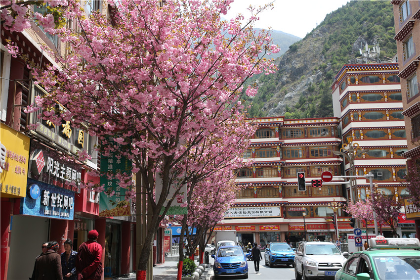 當(dāng)春天遇見最美的櫻花時(shí),驚艷了整個(gè)康定。櫻花與身邊人都將成為春日里的浪漫風(fēng)景。櫻花之美,美在氣勢,櫻花紛飛,夢幻唯美。每年4月中旬,康定城北門的櫻花綻放后,人們像是約好了一樣聚集到這里,共赴這一場甜美盛宴。這一路繁花似錦,人們穿過枝椏花正盛的櫻花林,穿過粉色海洋,徑直奔向一個(gè)浪漫的童話,一路櫻花飄散,一路粉光燦爛。櫻花絢麗繽紛、陸續(xù)綻放,若恰逢一陣春風(fēng)經(jīng)過,櫻花瓣隨風(fēng)舞動(dòng),猶如紛落的雪花,空氣中浮動(dòng)著櫻花特有的淡淡香氣,令人不禁懷疑自己置身夢境?!翱刀ǖ拇禾靵淼靡硪恍?,綻放的櫻花,滿街的花草,折多河畔楊柳依依,康定的春天無比驚艷,醉了游人?!敝芟壬贿吪恼眨贿吀袊@,他在康定生活了40多年,20年前的康定,可以說找不到像樣的花草樹木,進(jìn)入新時(shí)代,康定城市變美了,城市綠化走在了前面,城市的美譽(yù)度舒適度不斷提升??刀ㄖ海荷珴M園,姹紫嫣紅,風(fēng)光旖旎。