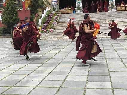 跳神儀式開始,南無寺內(nèi)鼓號齊鳴,喇嘛身著顯耀盛裝,點(diǎn)燃新綠松枝,幾縷藍(lán)色煙紋升起。一支由法鼓、鈸、海螺、法號等組成的寺廟樂隊自大殿而出,順時針繞場一周落座場邊,群神出場繞圈而舞,以示凈化場地,祈請諸神入位。接著,象征護(hù)法神舞、骷髏舞、鹿神舞、黑帽咒師舞和金剛力士舞的演員手持各類法器挨個入場手舞足蹈。舞蹈的起落根 據(jù)場邊奏響的器樂節(jié)奏進(jìn)行。最后由眾神驅(qū)鬼逐邪,押送“朵馬”(由糌粑捏成用以供神施鬼的食品)至寺外拋丟焚燒,以示驅(qū)逐一年的邪魔,祈禱來年安樂。