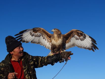 “小一點的鷹好訓(xùn),訓(xùn)老一點的叫熬鷹。 開始熬鷹前,一次性喂飽鷹,七天七夜不吃不喝不睡覺,待七天時到,放鷹于空,手中拿肉,用我們倆特殊的交流方式指揮它,這時它會落我的手臂上。但是,這一只始終沒服過我。訓(xùn)出來一只大約半月左右?!庇?xùn)鷹人說。