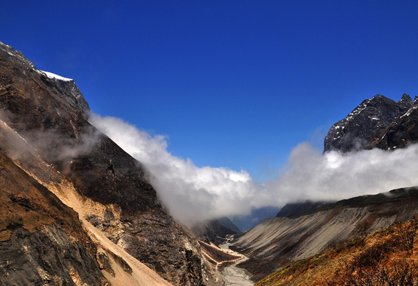第二天,我們準備游玩燕子溝,醒來的第一件事就是拉開窗簾看看天氣,又一陣興奮,天氣依然非常晴朗,今天是進燕子溝的第一天,我早做足了準備,太陽帽、墨鏡、食品等等一樣不少。從磨西到燕子溝溝口的路程很長,需要坐景區(qū)的觀光車,因為天氣的原因,山上只有少些云霧繚繞,環(huán)在山腰,仿佛是一幅山水畫景。我們先來到了冰窖口,這里的海拔有三千多米,所幸大家都沒有高原反應(yīng),后坐車下山,來到有“定海神針”之稱的一棵高大筆直的杉樹。這棵杉樹皮粗厚,已經(jīng)沒有了樹葉,樹枝也寥寥無幾,更顯滄桑。站在樹下遙望,顯得人是那么渺小。不禁讓人遐想這顆千年古樹的滄桑歷史。然后開始步行游玩,這里海拔比較低,走 起來不是很累,在城市中見慣了高樓大廈,車水馬龍的我們,此刻真有一種離開凡塵,來到世外桃源的感覺,我們一路依山而上,越走越高。我們終于來到了天藥水坪,這里的景色已經(jīng)完全不同于山下,看著遠處的山,我們都不約而同地“哇”了一聲。
