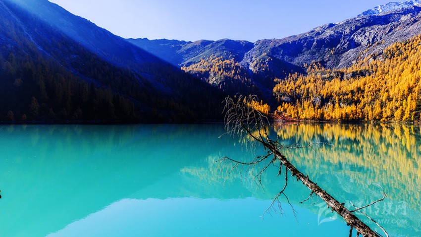 這個時間,藍天、雪山、黃松、碧海,構成了一幅難得的天然畫卷。
