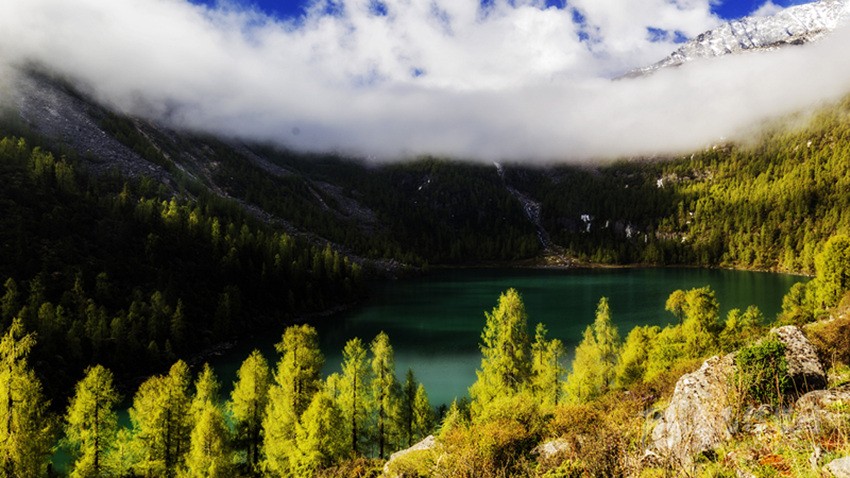 此海子與亞丁景區(qū)內的牛奶海最大的不同就是,海子周圍除了有巍峨的雪山,還有成片的森林環(huán)繞。