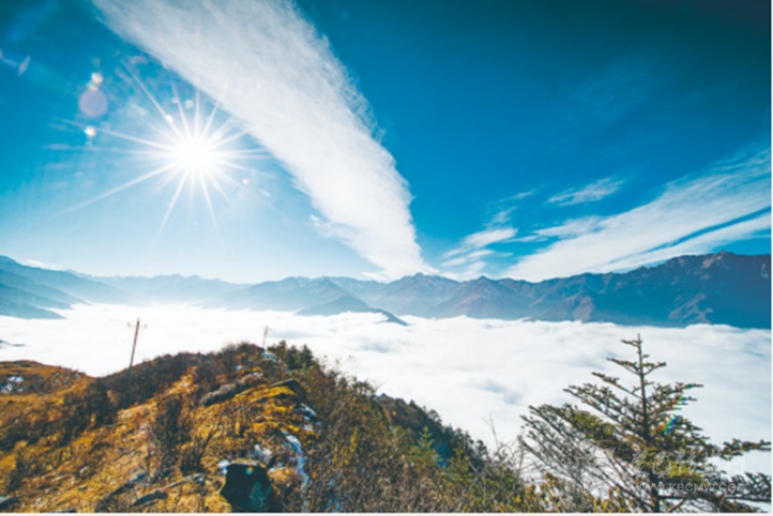 在阻隔灣壩通往外域的山脈中,有一個(gè)地方名為小卡子。一條簡(jiǎn)易的林區(qū)便道通往那里。從這條便道穿越峽谷的最陡處,越過林線的高度,最終將會(huì)馳上一條刀刃狀的山脊。脊的兩側(cè),西為著名的大雪山、貢嘎山,東為令牌山、則爾山。這條山脊的海拔在5000米左右,這是足以傲視群山的高度,而且恰恰又是云層頂端的高度。常常溝底陰云低罩,山腰云霧繚繞。到了山脊,天空頓時(shí)空闊遼遠(yuǎn),艷陽高照,而山脊的兩側(cè),云海飄渺,宛若仙境。而遠(yuǎn)處的山巒大多又在云層之上,峰高云低,如孤島浮舟。