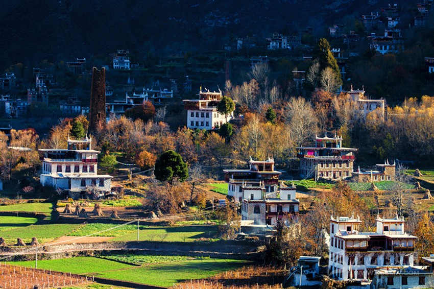遠(yuǎn)遠(yuǎn)望去,一座座藏寨被色彩斑斕的彩林包圍之中,或稠密集中,或星落棋布,或在高山懸崖上,或在河壩綠茵間……伴著潺潺溪流,在緩緩升起的太陽(yáng)照射下,隱在密林深處的寨房和農(nóng)田形成一幅美輪美奐的畫(huà)卷,可謂是“人間天堂”。