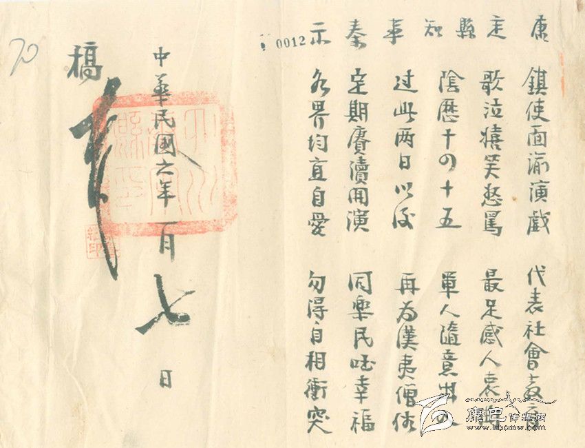 除此之外,康定縣知事又煞費苦心地再寫了一篇“順口溜”式的告示,告示上寫道:鎮(zhèn)使面喻演戲,代表社會教育。歌泣嬉笑怒罵,最足感人衷曲。陰歷十四十五,軍人隨意出入。過此兩日以后,再為漢藏僧俗。定期庚續(xù)開演,同樂民國幸福。各界均宜自愛,不得自相沖突。