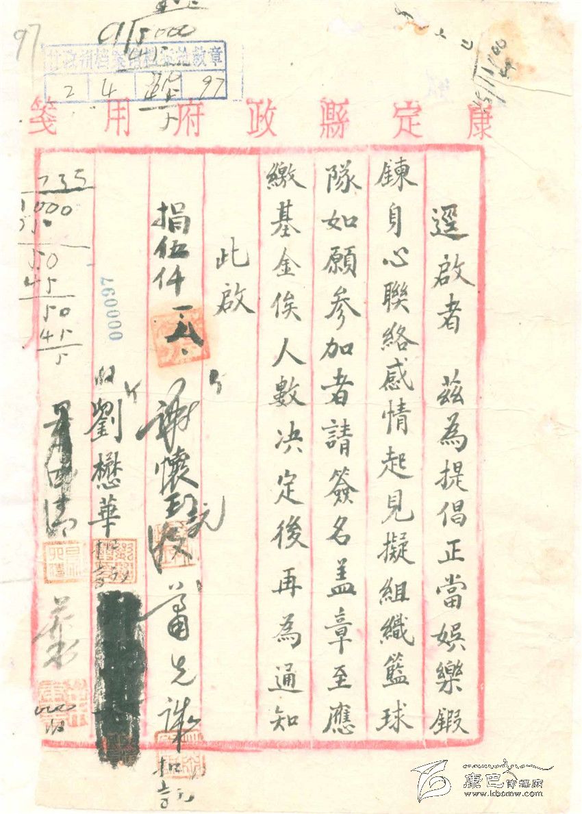 這是一張用解放前的康定縣政府便箋寫的“啟事”,內(nèi)容是倡議成立一支籃球隊(duì)。在上面簽字的有十多個人,這十多人一定是籃球運(yùn)動的愛好者。至于這支籃球隊(duì)后來是不是成立等等都不見下文。而且,從這張“啟事”上看不到這件事發(fā)生在哪一年,只有一位名叫李培清的人寫下了收到捐款5700元、“三月三十日”的日期。最有意思的就是,在這張“啟事”上記下了的這句話:縣長捐購籃球款伍仟元。這句話起碼包涵了以下的意思,一,康定城里已經(jīng)興起了籃球運(yùn)動;二,成立籃球隊(duì)沒有專門的經(jīng)費(fèi),幸好人們有很高的積極性,連縣長也主動捐款,那些簽名后面隱約可見的數(shù)字也可能是捐款的數(shù)字。