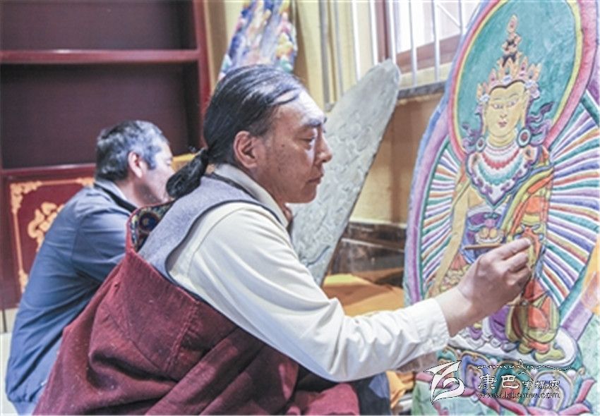 從子承父業(yè)再到吸眾家之長,自離開故鄉(xiāng)的那天起,巴德的視野開始變得開闊起來。1979年到省藏校學(xué)習(xí)藏文和美術(shù),并開始涉獵泥塑技藝,隨后又向德格民間藝人扎西澤郎學(xué)習(xí)彩繪石刻,然后又到西藏、甘肅等地學(xué)習(xí)繪畫、石刻技藝。巴德說,自己之所以有今天的藝術(shù)造詣,是因?yàn)橛幸慌麕熤更c(diǎn),是因?yàn)樽约旱牟粩嗵剿骱烷L期堅(jiān)守。讓他欣慰的是,自己的三個(gè)兒子都在學(xué)習(xí)石刻和繪畫,親戚朋友中的十多個(gè)孩子也成了他的入門弟子。
