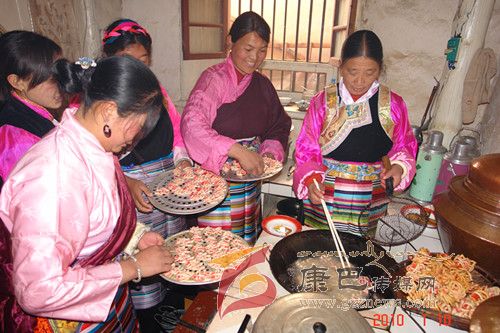 巴塘人一年當(dāng)中有很多重要的節(jié)日,而最重要的莫過于過春節(jié)。隨著農(nóng)歷新年的來臨,巴塘人過春節(jié)的氛圍也越來越濃烈了。掃塵、貼春聯(lián)、殺年豬、罐血腸、樹經(jīng)幡、獻“切瑪” 、曬牛肉干、做長面、炸“花茹” 、 釀青稞酒等等,人們臉上綻放出春天的笑顏,喜逐顏開迎候新春佳節(jié)的到來。而在眾多的風(fēng)味飲食中,炸“花茹” 、 吃長面(當(dāng)?shù)厝朔Q之為“金絲面”)是巴塘人春節(jié)時家筵中必不可缺的美食佳肴。