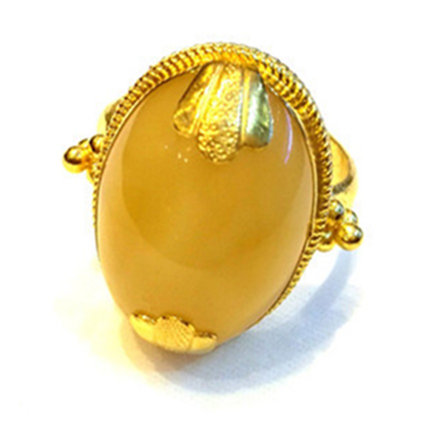 蜜蠟是藏家裝飾中的上成品,藏民族對蜜蠟的喜愛是非常誠懇的,表達(dá)著他們對大自然的無限崇敬之情與大自然饋贈的感謝之情。在他們看來,蜜蠟除了能夠作裝飾品佩戴、收藏之外,最引人注目的就是靈性修行之功效,設(shè)計師在此款戒指的設(shè)計上,緊扣藏民對蜜蠟的喜愛,并將漢式花邊與蜜蠟結(jié)合,是對藏漢文化交流較好的體現(xiàn)。