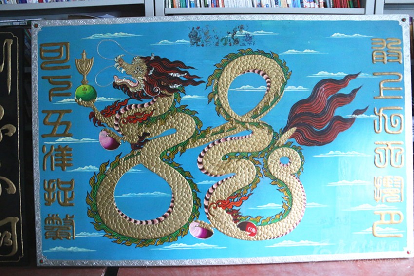走進(jìn)王長(zhǎng)生的工作室,他保存有古董級(jí)的電影放映機(jī)、留聲機(jī)、電話、黑白電視機(jī)、照相器材和吉他、二胡、笛子等樂(lè)器應(yīng)有盡有,看到這些古老的“裝備”,記者仿佛走進(jìn)了那段塵封的歲月。2008年,王長(zhǎng)生創(chuàng)作的雕刻畫(huà)《昂首蒼穹》,走進(jìn)成都國(guó)際博覽中心,國(guó)家文化產(chǎn)業(yè)設(shè)計(jì)院的兩名專家評(píng)價(jià)說(shuō),作品的文化內(nèi)涵和藝術(shù)觀賞性都很高。王長(zhǎng)生解釋說(shuō),龍是中華民族的圖騰,龍中之龍?jiān)⒁鉃樯暇盘鞌堅(jiān)?,下五洋捉鱉,反映了中華民族的豪氣。
