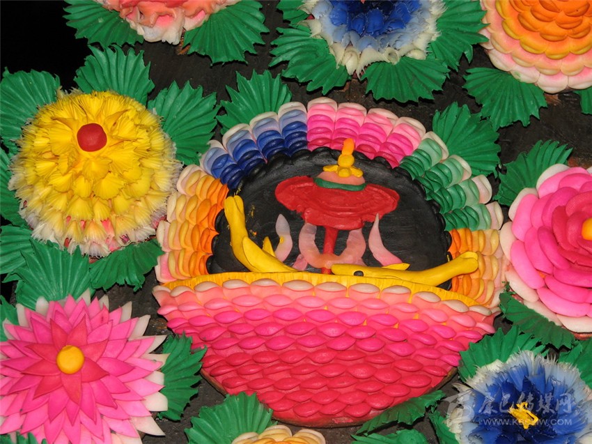 制作酥油花先是“扎骨架”根據(jù)所表現(xiàn)的內(nèi)容,用加工的柔軟草束、麻繩、竹竿、棍子等物扎成大大小小不同形態(tài)的“骨架”,即所塑造的基本模型。其次是“做胚胎”,塑造的第一道原料是用上年拆下來的陳舊酥油花摻和上草木灰反復捶打,制成韌性好彈性強的黑色塑造油泥。然后裹在骨架上完成粗糙但準確的一個個大造型,其塑法近似面塑或泥塑。再次是“敷塑”,塑造的第二道原料是在加工成膏狀的乳白色酥油中揉進各色礦物質顏料,調(diào)和成五顏六色的油塑原料,仔細的涂塑在做好的形體上,有的還要用金、銀粉勾勒,完成各色形象的塑造。要是塑造紅花綠葉,或是玲瓏剔透的玉石寶玩,則直接用彩色油料一次塑成。為了防止塑制中因手的溫度而使酥油胚料融化變形,藝僧們在室溫控制在零度的作坊里,身邊放有一個盛有冰塊的水盆,他們要不時將手浸入冰水中。整個制作過程十分艱辛,藝僧們的手上大多會生出凍瘡。對佛教的虔誠和對藝術至美的追求,完全超越了肉體上的痛苦,冰冷的手中,艷麗的酥油花不斷生成。最后酥油花一道工序是“裝盤”,將塑好的酥油花按設計的總圖要求,用鐵絲一一安裝到位,固定在幾塊大木板上或特制的盆內(nèi),高低錯落有致,件件立體懸空,觀賞者可以從不同的角度觀瞻玩味。布局成單一的花卉圖案或整幅的故事畫面,俗稱“酥油花架”,展出時,“酥油花架”會用高桿立起,最高可達十幾米,人們在下以仰視角度觀看,更覺佛法莊嚴,寶像生輝。一座大的花架上,往往要塑造幾十個、甚至一二百個人物組成的故事畫面。其中菩薩金剛端坐安詳,飛天仙女身姿綽約,花鳥蟲魚栩栩如生,人物神形兼?zhèn)?,亭臺樓閣金碧輝煌,整個畫面繁而不亂,絢麗多彩,令人嘆為觀止。
