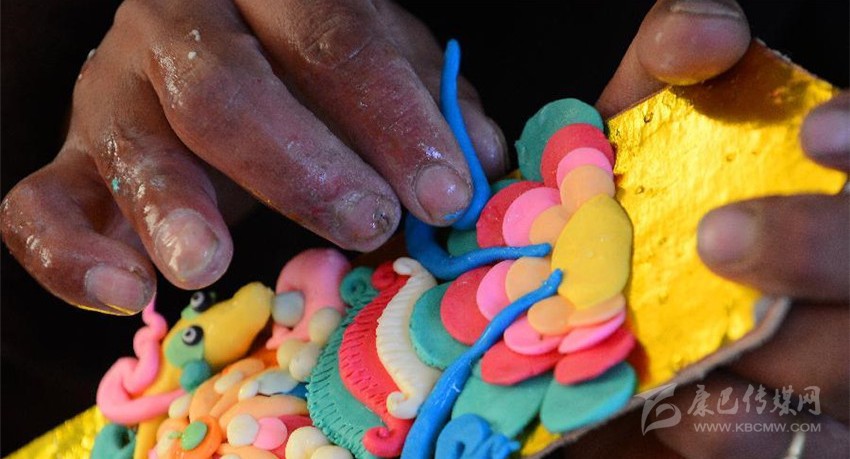 一盆冰涼的水、一坨坨顏色各異的酥油。巴塘縣康寧寺里,幾位藝僧正在滴水成冰的天氣里,手指不停浸在水中,然后掐出一塊塊酥油,捏成各種佛像、人物、飛禽走獸以及花卉草木,栩栩如生。