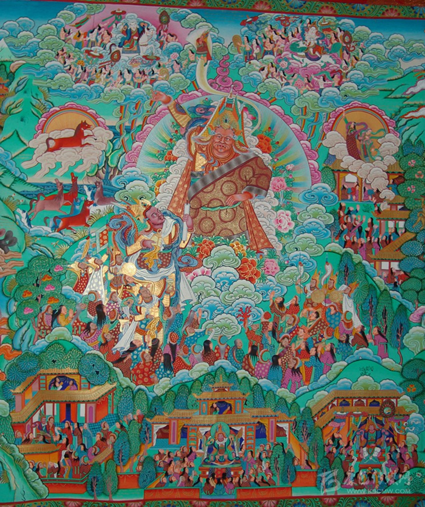 解放前的舊西藏以及其他藏區(qū),基本上處于封建農奴制社會和部落社會,實行政教合一的政治制度。過去藏族基本上是一個全民信教的民族,佛教文化和苯教文化在意識形態(tài)和文化領域占據(jù)統(tǒng)治地位,“德唐”、“協(xié)唐”和“杰唐”也成為唐卡藝術的主要內容。因此,反映宗教觀念、表現(xiàn)宗教題材的唐卡,得到上層統(tǒng)治階級和信教群眾的關心、重視和扶持,發(fā)展迅速,數(shù)量眾多、藝術精湛,達到美侖美奐的程度。為了更深入、更全面地將宗教教義、宗教儀軌、宗教觀念、宗教信仰深入到信教群眾中去,最基本、也是最有效的方式,就是將宗教觀念、宗教信仰藝術化、形象化,讓藝術形象凝聚為宗教文化,讓唐卡藝術生動地、形象地、以通俗易懂的方式講述歷史故事,傳播宗教教義。一些重要的唐卡繪制完畢,還會舉行隆重的開光儀式和祈禱法會,以增強它的神圣性和神秘感。各寺院懸掛的、珍藏的幾乎全是這類唐卡。在過去,豪門貴族、土司頭人,乃至普通人家,也都有懸掛和珍藏唐卡的習俗。一座寺院收藏幾千幅、乃至上萬幅唐卡,是很平常的。
