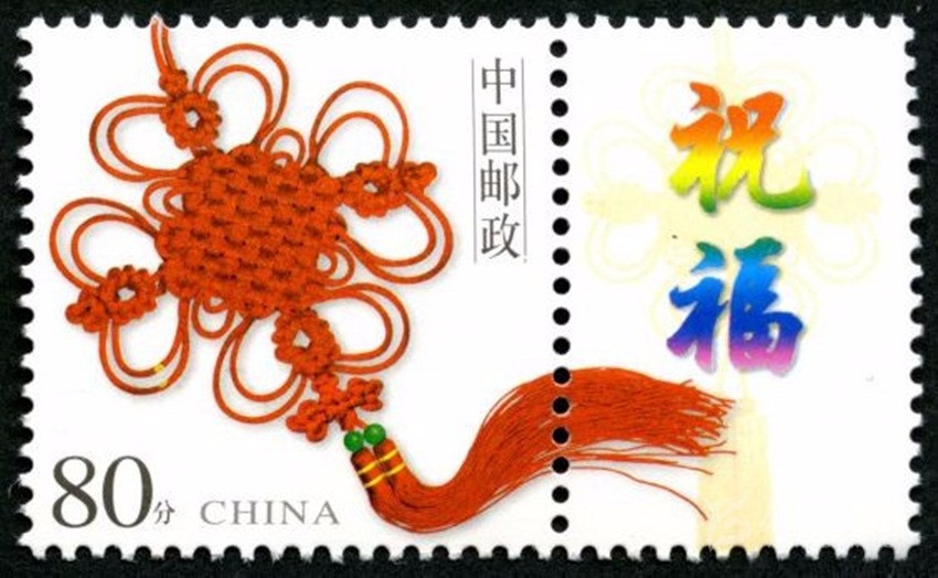 2002年5月10日,中國(guó)郵政發(fā)行《如意》個(gè)性化服務(wù)專(zhuān)用郵票一枚。主票圖案為如意柄端系著一個(gè)紅色“中國(guó)結(jié)”,附票有“祝福”二字; 2003年3月3日,中國(guó)郵政發(fā)行《同心結(jié)》個(gè)性化服務(wù)專(zhuān)用郵票一枚。主票圖案為盤(pán)長(zhǎng)結(jié)4邊編織有心型繩結(jié)的同心結(jié),附票為“祝?!倍郑?006年9月25日,中國(guó)郵政發(fā)行《中華全國(guó)歸國(guó)華僑聯(lián)合會(huì)成立五十周年》紀(jì)念郵票一枚。圖案為阿拉伯?dāng)?shù)字“5”與中華全國(guó)歸國(guó)華僑聯(lián)合會(huì)圓形會(huì)徽組成數(shù)字“50”,象征全國(guó)僑聯(lián)五十周年,背景畫(huà)面為淡淡的粉紅色“中國(guó)結(jié)”。寓意歸國(guó)華僑與全國(guó)人民血肉相連,同心同德共同建設(shè)美好家園;2013年8月8日,中國(guó)郵政發(fā)行一枚《美好祝?!焚R卡專(zhuān)用郵票,圖案為象征喜慶的紅色“中國(guó)結(jié)”;2014年9月20日,中國(guó)郵政發(fā)行《中國(guó)夢(mèng)(二)——民族振興》特種郵票,其中第四枚“民族團(tuán)結(jié)”,圖案中載歌載舞的各民族群眾上方有一個(gè)大紅的“中國(guó)結(jié)”,象征著各民族大團(tuán)結(jié)。