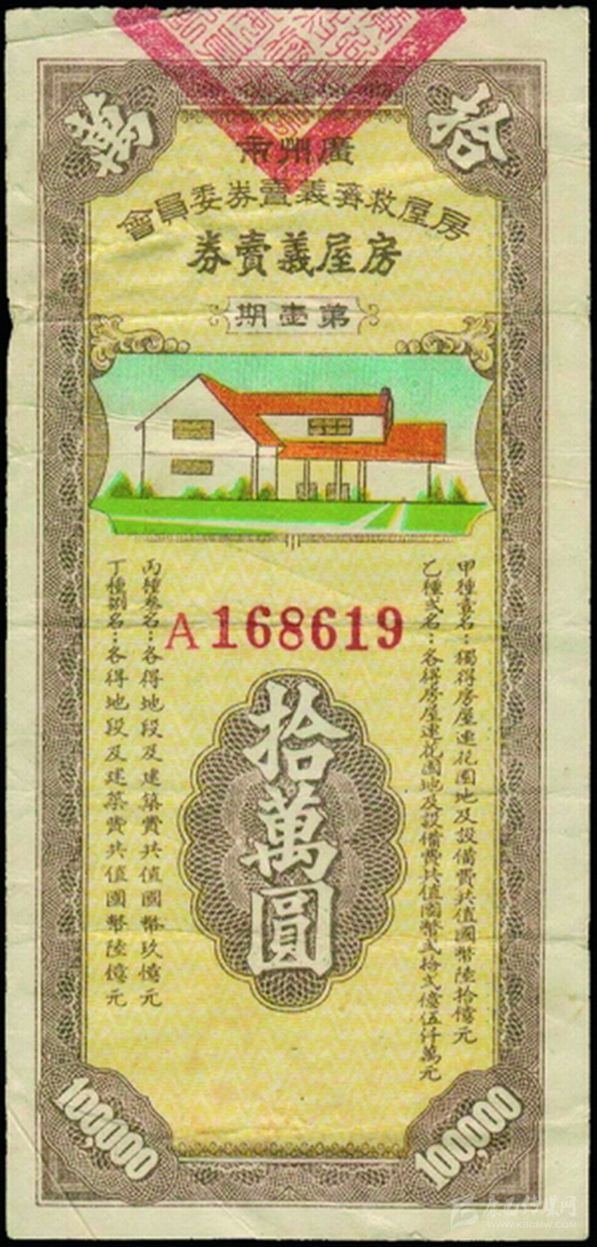 1948年2月,廣州市房屋救濟(jì)義賣券委員會(huì)每月發(fā)行一次房屋義賣券。第一期房屋義賣券面值10萬元,共發(fā)行30萬張。設(shè)甲、乙、丙、丁種中獎(jiǎng)?wù)吒?、2、3、8名,其中甲種獨(dú)得房屋連花園地及設(shè)備費(fèi)共值國幣六十億元,乙種各得房屋連花園地及設(shè)備費(fèi)共值國幣二十二億元五千萬元,丙種和丁種得土地及建筑費(fèi)分別值九億元、六億元。第二期房屋義賣券仍發(fā)行30萬張,但每張面額上升到國幣20萬元,獎(jiǎng)項(xiàng)變?yōu)橹歇?jiǎng)?wù)呒追N1名,獨(dú)得房屋兩間及設(shè)備費(fèi)十億元;乙種2名,各得房屋兩間;丙種3名,各得房屋一間另設(shè)備費(fèi)五億元;丁種4名,各得房一間。