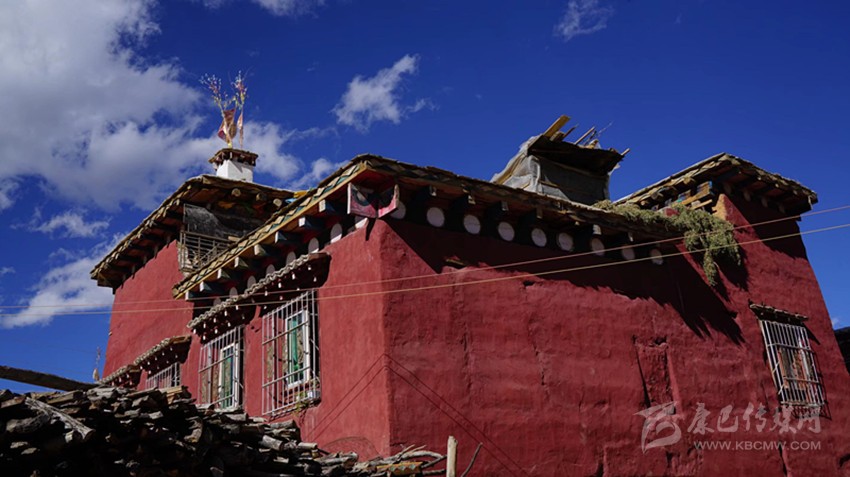 外裝飾也不繁復(fù)。外墻用磚紅色粘土調(diào)成泥漿上色,現(xiàn)在多用化學(xué)顏料。大門用一種叫“抓”的天然礦物質(zhì)涂料,這種顏料容易染色,挨一挨都會讓衣服沾上絳紅色,現(xiàn)在也用化學(xué)涂料代替。二樓與“砸口樓”檐口處裸露在外面的木頭,用漆絳紅色顏料涂抹,支出來的小圓木涂白色顏料。遠(yuǎn)遠(yuǎn)望去,紅白相間,錯落有致,巴塘方言藏語稱之為“東椎”。檐口頂上用排成“人”字形的小青瓦點綴,窗框和門框都涂成絳紅色,也用“東椎”與青瓦裝飾;有條件的人家安裝雕花窗棱,嫌麻煩就用普通的大格子窗。外置庭院,種花植木,一座傳統(tǒng)的紅藏房便竣工了。