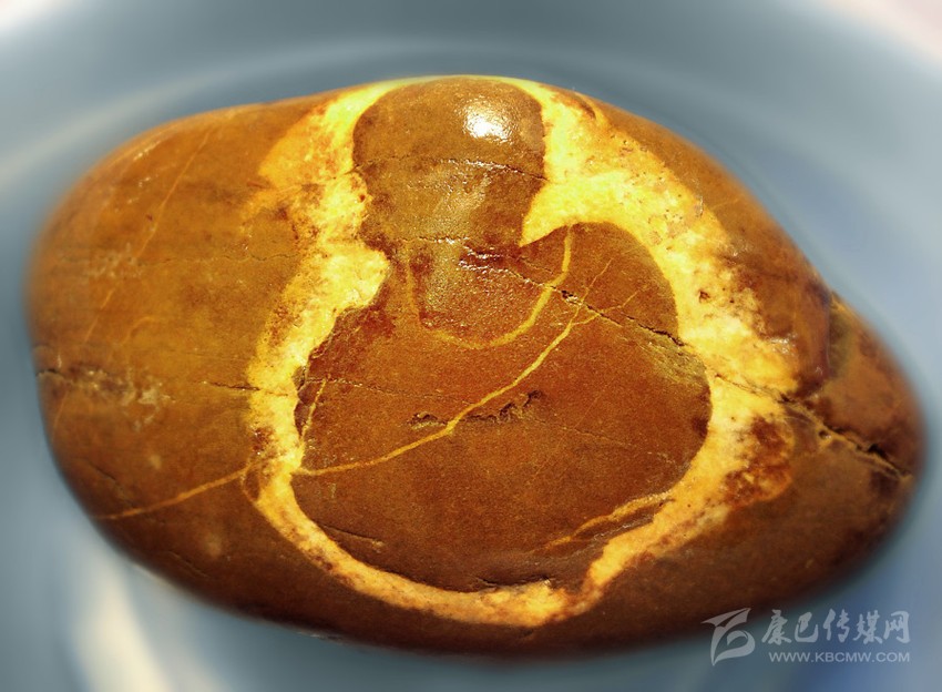 作為一個(gè)無(wú)組織的業(yè)余獨(dú)行淘石者,經(jīng)過(guò)數(shù)年的摸、淘、琢磨,我悟出:發(fā)掘趣石最重要的是要獨(dú)具慧眼慧心,會(huì)讀石紋。是否讀懂石紋,決定著一塊石頭是頑石還是奇石的命運(yùn)。這是一件很難的事,不僅要運(yùn)用你獨(dú)特的審美視角,還得發(fā)揮你豐富的想象。有時(shí),為了讀懂一些石紋,我會(huì)抱著這塊石頭如考古學(xué)家般仔細(xì)琢磨,從正面、側(cè)面,再到背面,又從左邊旋到右邊,或者上下顛倒來(lái)打量……一番冥思苦想,會(huì)意會(huì)神,直到靈感涌起、慧心頓悟,尤如洞天石扉訇然中開(kāi),眼前的頑石拙巖,頃刻便化為藝術(shù)珍寶,令我欣喜若狂。正如悉達(dá)多說(shuō):“這塊石頭是石頭,它也是動(dòng)物,也是神,也是佛,我敬重它和熱愛(ài)它,并非因?yàn)樗谐蝗諘?huì)變成這個(gè)或那個(gè),而是因?yàn)樗缇褪沁@一切,一直是這一切?!背錆M靈性的石頭在你和美妙的自然間搭起了一座通靈的橋梁。淘得趣石,還需緣分。就像人與人的相遇講究緣分,遇到心儀的石頭也講究緣分天助。有年春節(jié),我與父親去河邊轉(zhuǎn)游,面對(duì)涪江寬闊的石灘,我的淘石癮又犯了。但出門(mén)前答應(yīng)過(guò)父親,這次只逛不撿石頭。我知道老爸心疼我一個(gè)女子大過(guò)年的撿石頭。河邊冷,且石頭扛起來(lái)很重,手與衣服都會(huì)弄得很臟。我邊陪父親漫走閑聊,眼睛卻止不住往河灘逡巡,仍希望無(wú)意中淘到中意的石頭。走著走著,我發(fā)現(xiàn)有一群鳥(niǎo)歡唱著從遠(yuǎn)處一個(gè)石堆飛起,冥冥中感覺(jué)那里有寶貝,遂向老爸懇求,過(guò)去看一下就回來(lái)。來(lái)到那個(gè)石堆中心,幾乎不費(fèi)什么功夫,就看到一塊橢圓形石頭上有著一個(gè)自帶金色佛光圈的如來(lái)佛半身像。我怔住了,有點(diǎn)不敢相信如此幸運(yùn),蹲在那里久久打量。老爸隨后趕過(guò)來(lái),看到佛像石,連連贊嘆了好幾句“太神奇了”。然后,他毫不猶豫地就幫我把石頭搬起來(lái)就走?;氐郊抑?,如獲至寶的我,趕緊清洗石頭,在清水的滋潤(rùn)下,佛像的輪廓更加清晰。頸上的佛珠、袈裟線也分明,細(xì)看令人叫絕的這竟是一尊三面佛:正面、左側(cè)向、右側(cè)向均是佛。而在此石背面,也清晰出現(xiàn)了一個(gè)草書(shū)的“吉”字,真令人喜出望外。吉佛石,就這樣神奇地走進(jìn)了我的生活,讓我相信一切緣分都是可遇不可求的。