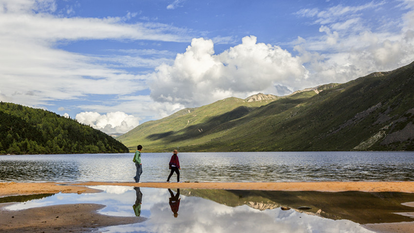 木格措特殊的位置和完好的生態(tài),造就了“一日四時(shí)景、早晚不同天”的自然奇觀。高原的第一縷晨光越過遠(yuǎn)峰,均勻地鋪灑在木格措湖面,湖水蘇醒過來,水面煙波浩渺,薄紗飛卷,如同早起后對鏡梳妝的仙女。午后有微風(fēng),遠(yuǎn)處湖面靜若處子,近前卻有微瀾拂岸,動(dòng)靜之間,盡得自然自在。斜陽西下,余暉投灑在水面上,湖水濃墨重彩,任意涂抹,水天一體,你我也融合在靜謐的湖光夜色中了。