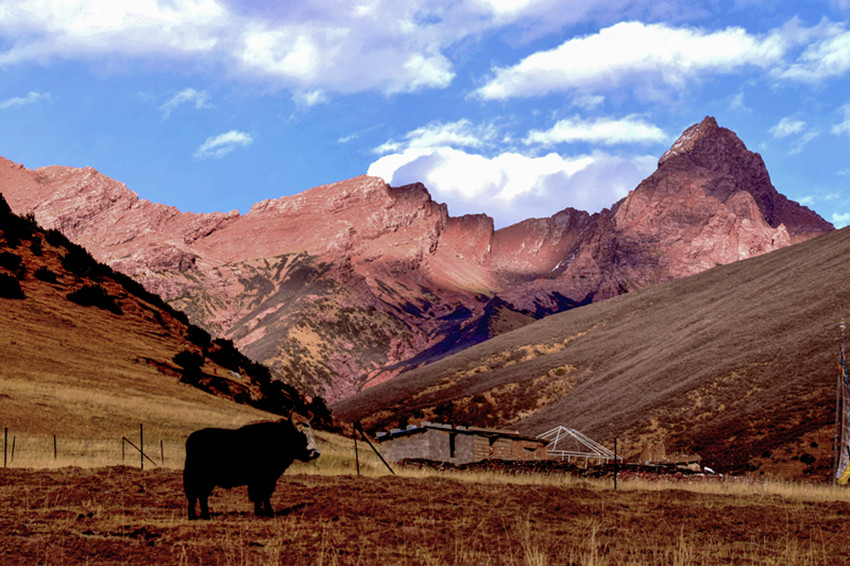 走進(jìn)火紅的新龍紅山懷抱,鮮艷峻峭的山峰絕壁,讓我想起康巴漢子頭上飄逸的絲穗,男子漢的英雄結(jié),康巴漢子剛烈的個(gè)性。這種鮮艷的紅,是大自然賦予康巴富饒土地的一個(gè)標(biāo)志吧——康巴紅。