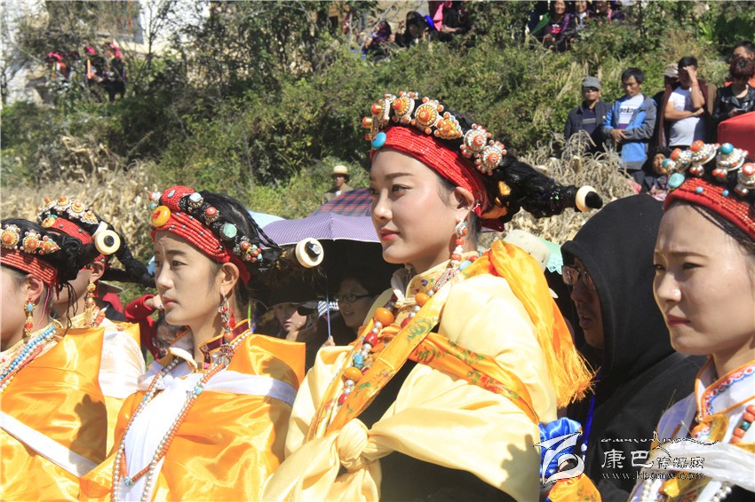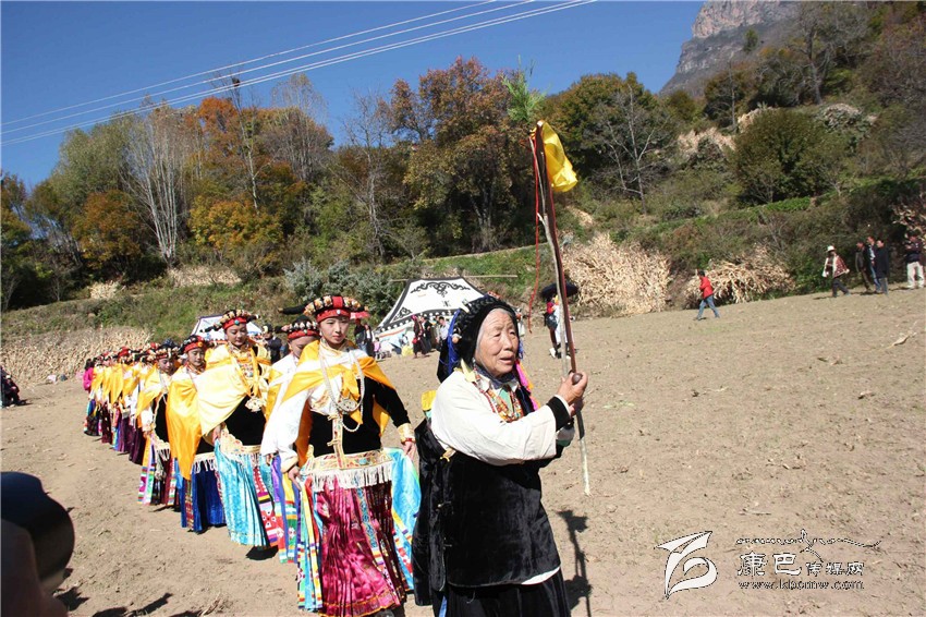 所有的祈福儀式結(jié)束后,村子里一位德高望重的長(zhǎng)輩走上圓臺(tái),用雄渾有力的嗓音向場(chǎng)地外等候的人們發(fā)出指令。在一段念詞結(jié)束之后,參加成人儀式女孩們的父親們?cè)谝晃焕先说闹敢戮従彽南驁?chǎng)地中央走來(lái),老人手舉一幅一米高的唐卡畫(huà),口中念念有詞,走在他后面的父親們一襲白色的毪衫,頭戴一頂灰色的禮帽,腳穿紅黑相間的藏靴,頸上掛著一根潔白的哈達(dá),滿(mǎn)臉肅然的緊隨老人之后,來(lái)到月形的臺(tái)子邊,站成一個(gè)半圓形。當(dāng)父親隊(duì)站定后,母親隊(duì)們也向場(chǎng)地中移步而來(lái),本次成人儀式的主角們?cè)谝晃焕习尩膸ьI(lǐng)下向場(chǎng)地中走來(lái),每一位女孩穿著打扮都是那么的光鮮靚麗,每一個(gè)人都顯得美麗動(dòng)人,她們披著黃色的披風(fēng),一根白色的哈達(dá)在胸前打著結(jié),五顏六色的哈達(dá)懸掛在這根哈達(dá)上,在姑娘們的后背迎風(fēng)飄飛。走到圓臺(tái)邊,小女孩們也圍成半圓,低著頭,等待著喇嘛們的念經(jīng)祈福和家人的祈福。此時(shí),兩位吉祥老人站了起來(lái),手中拿著凈瓶,走到姑娘們面前,一邊念誦經(jīng)文,一邊將手中凈瓶里的水倒在姑娘們的手心里,姑娘們則虔誠(chéng)的將這圣水輕輕的抹在自己的額頭上,寓意吉祥如意。待喇嘛主持儀式結(jié)束后,主持儀式的老人用嘉絨語(yǔ)向蒼天和墨爾多神山祈禱,希望神賜予孩子們美麗的面容和美好的心靈,從今日起,她們就可以真正的長(zhǎng)大成人了。吉祥詞念誦完后,母親們排著長(zhǎng)長(zhǎng)的隊(duì)伍緩緩來(lái)到孩子們的面前,將懸掛在胸前的哈達(dá)取下,久久的凝視著女兒的臉,眼角掛著幸福的淚水,用顫抖的聲音為女兒祈福,叮囑孩子們要孝敬父母,做一個(gè)正直善良的人,然后,才將白色的哈達(dá)掛在女兒的頸上,父親們則站在原地,看著母親們將哈達(dá)和祝福送給女兒,見(jiàn)證著女兒們的長(zhǎng)大成人。接受完父母和長(zhǎng)輩們的祝福之后,盛大的鍋莊舞會(huì)開(kāi)始了。小女孩們也跟隨著這些舞者們手牽著手走到場(chǎng)地中央,跳起歡快的鍋莊舞。擁忠大娘說(shuō),成年禮上的鍋莊舞會(huì)一般都要視參加成人禮儀式女孩們親戚多寡而定,每一名長(zhǎng)輩都會(huì)走到場(chǎng)地中牽頭,跳起舞蹈,這時(shí)候是女孩的長(zhǎng)輩們炫耀舞技和歌聲的時(shí)候,他們矯健的舞步和甜美的歌喉迎來(lái)眾人的和鳴。