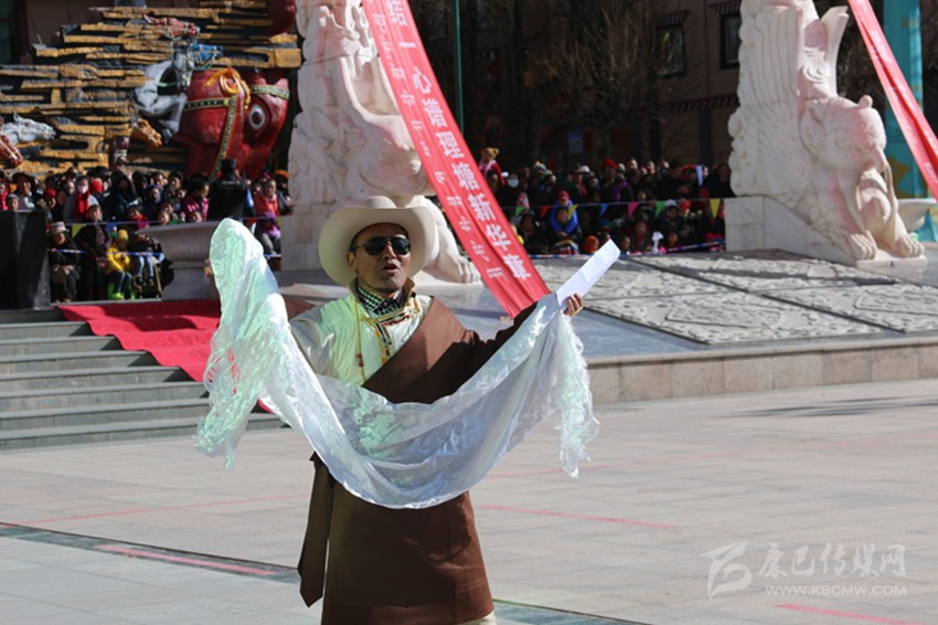 吉祥頌,藏語(yǔ)稱為“協(xié)巴”,是州級(jí)非物質(zhì)文化遺產(chǎn)之一。“協(xié)巴”在藏族民間生活中占有重要的地位,尤其在喜慶活動(dòng)上,是一項(xiàng)不可或缺的重要儀式。州級(jí)非物質(zhì)文化遺產(chǎn)傳承人——高城鎮(zhèn)車馬村的翁堆老人手捧潔白的哈達(dá),為觀眾表演了《協(xié)巴——中國(guó)夢(mèng)、理塘夢(mèng)》,展現(xiàn)了時(shí)代變遷中,“吉祥頌”這一民間藝術(shù)在思想內(nèi)容和藝術(shù)手法的創(chuàng)新之美。