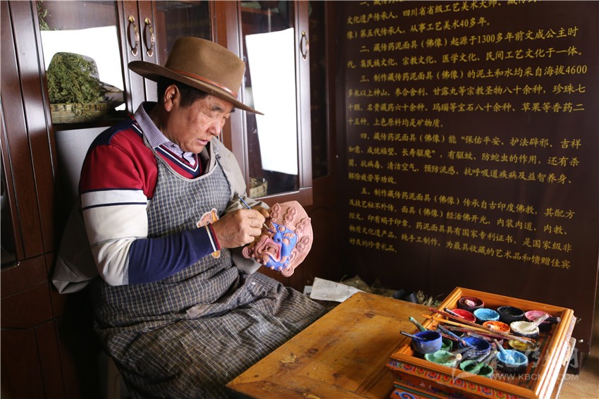 作為一名旅行者,四龍降澤老人熱情地接待了我,他是新龍縣人,因?yàn)槠拮邮堑梨谌耍诵莺箅S妻子在道孚生活。從14歲開始學(xué)習(xí)制作藥泥面具,迄今為止已經(jīng)有了50年的制作經(jīng)歷,手藝愈發(fā)成熟,其中一句“藥配好了是藥,配不好就是毒”讓人印象深刻,因?yàn)榈絹淼臅r(shí)間恰巧,有幸見到大師制作藥泥面具的過程,算是這場(chǎng)沖動(dòng)旅行的意外驚喜。
