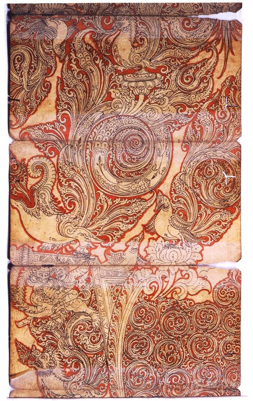 (二)裝飾圖案化:藝術中的“希臘化”過程,蔓延到南亞地區(qū),已是“強弩之末”。故南亞美術受到希臘藝術的影響,但是并不徹底。所以在表現物象體積和空間的時候,顯得力不從心,往往是想寫實的物象表現成裝飾性的圖案,時間一長,便演變成為南亞的審美傳統(tǒng)。比如各種動物和植物紋樣,以及卷草紋、連珠紋等。尼瓦爾唐卡中的人物、動物、植物和事物大多通過精美的、圓弧組成的各種裝飾圖案來表現。