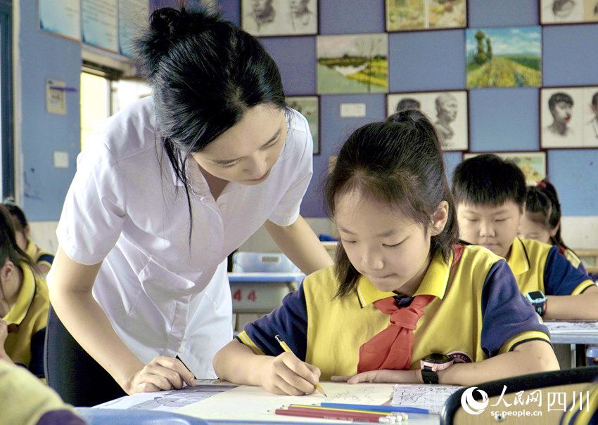 5月31日,南充市嘉陵區(qū)之江小學,學生在老師指導下學習繪畫。人民網 趙祖樂攝