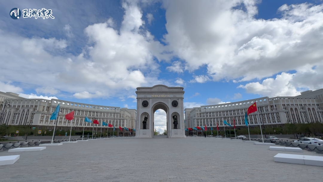 譚主抵達(dá)阿斯塔納,象征著哈薩克斯坦歷史的“凱旋門”周圍飄揚(yáng)著歡迎旗幟