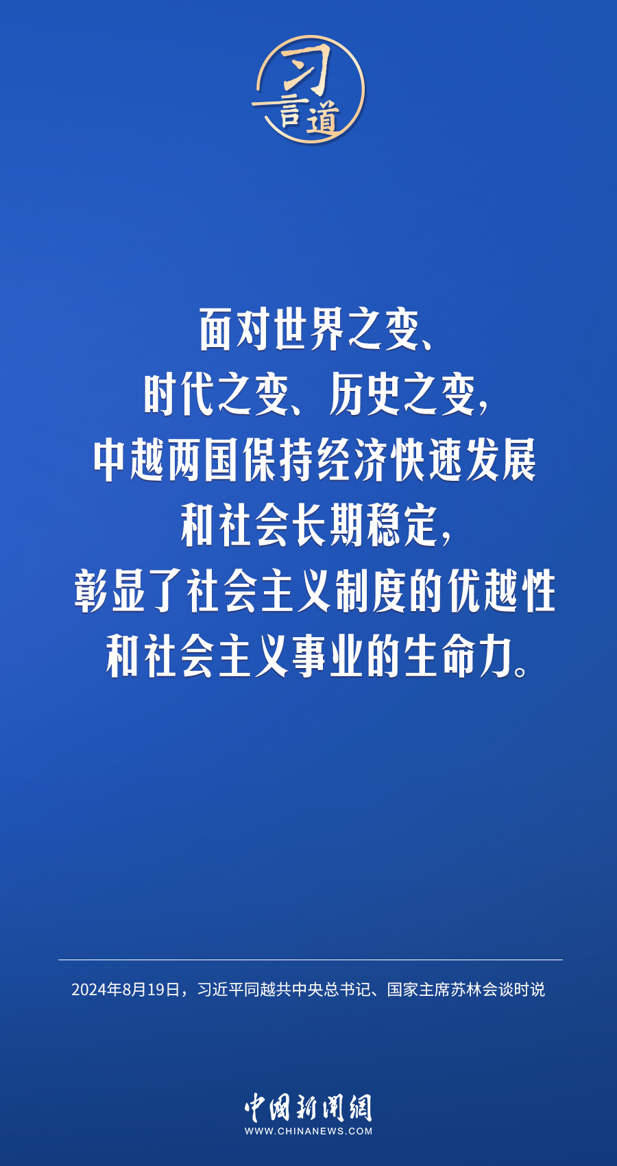 8月19日,中共中央總書記、國家主席習近平在北京人民大會堂同來華進行國事訪問的越共中央總書記、國家主席蘇林舉行會談。習近平指出——