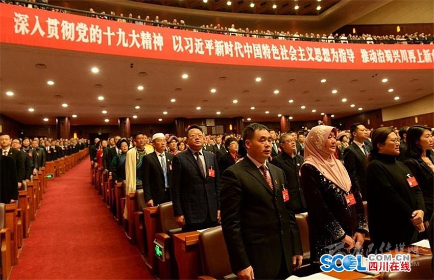 上午10時許,王東明宣布:四川省第十三屆人民代表大會第一次會議開幕。全體起立,雄壯的中華人民共和國國歌在會場內(nèi)唱響。