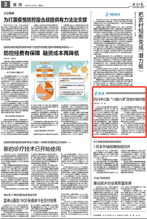 2月8日,經(jīng)濟(jì)日?qǐng)?bào)對(duì)四川德陽(yáng)中江縣在疫情防控中,搞好環(huán)境衛(wèi)生的好做法進(jìn)行了報(bào)道,全文如下: