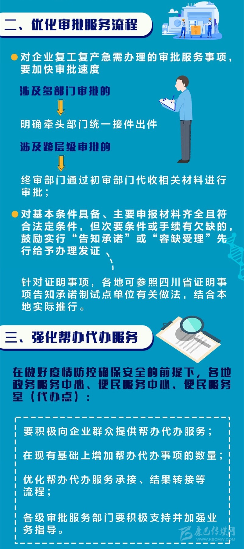 答:通知明確,各地政務(wù)服務(wù)中心、便民服務(wù)中心、便民服務(wù)室(代辦點(diǎn))要在做好疫情防控確保安全的前提下,積極向企業(yè)群眾提供幫辦代辦服務(wù),在現(xiàn)有基礎(chǔ)上增加幫辦代辦事項(xiàng)的數(shù)量,優(yōu)化幫辦代辦服務(wù)承接、結(jié)果轉(zhuǎn)接等流程,各級(jí)審批服務(wù)部門要積極支持并加強(qiáng)業(yè)務(wù)指導(dǎo)。
