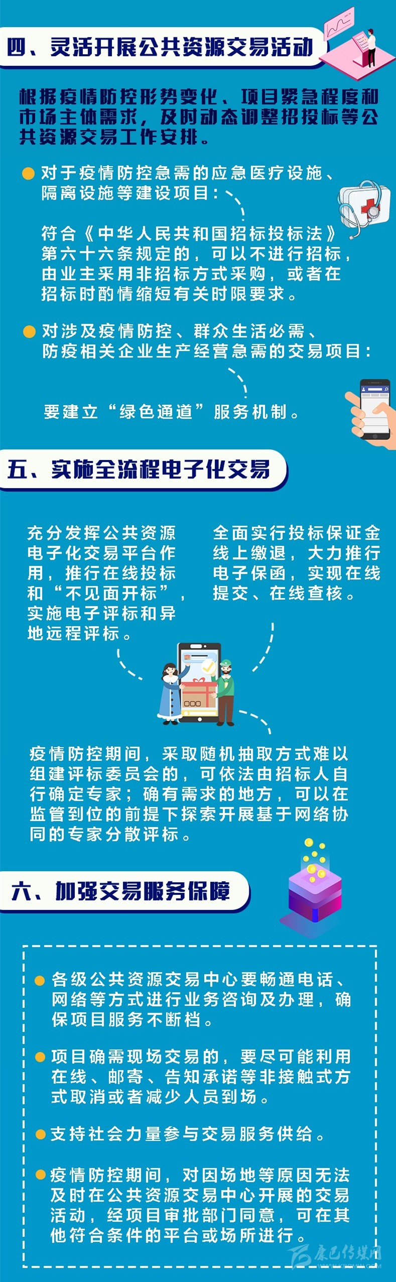 答:近年來(lái),我省按照國(guó)家和省委省政府安排部署持續(xù)推進(jìn)公共資源交易全流程電子化,取得了顯著成效。在疫情防控的特殊時(shí)期,更要充分發(fā)揮公共資源電子化交易平臺(tái)作用,推行在線投標(biāo)和“不見面開標(biāo)”,實(shí)施電子評(píng)標(biāo)和異地遠(yuǎn)程評(píng)標(biāo)。同時(shí),全面實(shí)行投標(biāo)保證金線上繳退,大力推行電子保函,實(shí)現(xiàn)在線提交、在線查核。疫情防控期間,采取隨機(jī)抽取方式難以組建評(píng)標(biāo)委員會(huì)的,可依法由招標(biāo)人自行確定專家;確有需求的地方,可在監(jiān)管到位的前提下探索開展基于網(wǎng)絡(luò)協(xié)同的專家分散評(píng)標(biāo)。