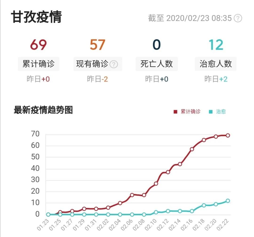 截止2月22日24時,我州累計報告新型冠狀病毒肺炎確診病例69例(道孚64例、康定2例、色達2例、稻城1例),其中治愈出院12例,在治重癥5例,危重癥1例,其余患者病情穩(wěn)定,均在定點醫(yī)院接受治療。其中,男性39例,女性30例,最大的77歲,最小的3歲。