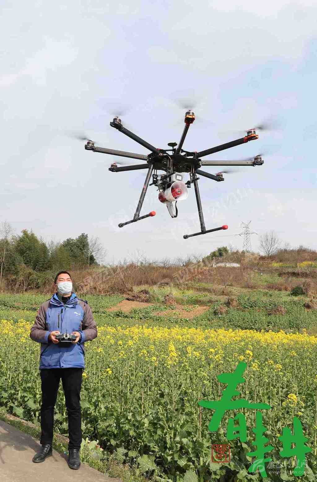 彭州市桂花鎮(zhèn)高峰村,技術(shù)員操作無人機穿梭在田間。